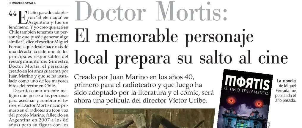Como destaca el artículo del diario El Mercurio, Doctor Mortis es uno de los personajes más memorables del terror chileno. Creado por Juan Marino en los años 40 para el radioteatro, el personaje ha atravesado generaciones, migrando a la literatura, el cómic y hoy, con fuerza renovada, al audiovisual.